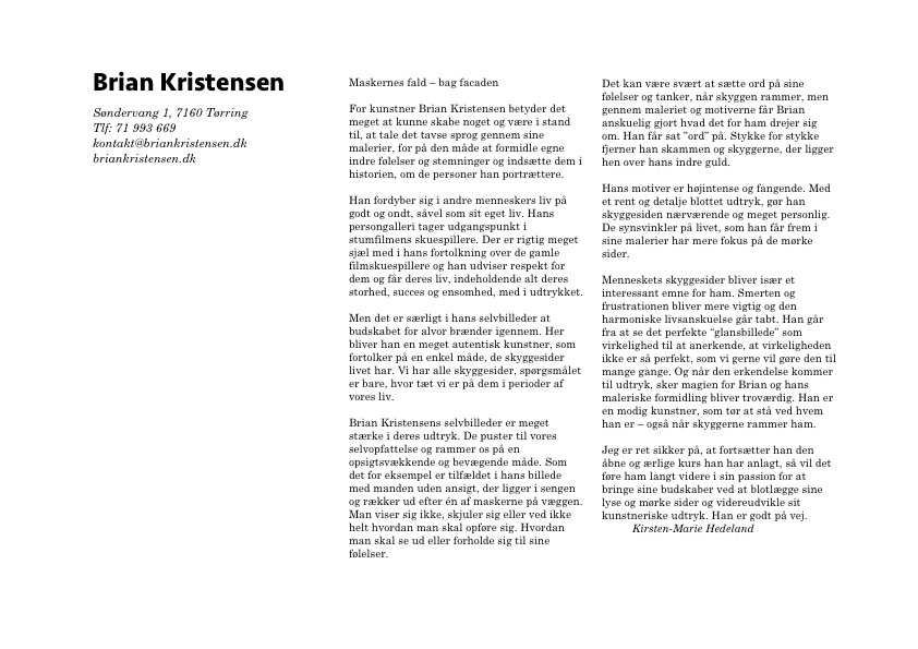 Her på denne side finder du mere information omkring baggrunden for de værker der er udgivet af mig, du finder link til tv-udsendelser, avis omtale med mere, og hvis du har flere spørgsmål er du selvfølgelig velkommen til at kontakte mig via kontakt@briankristensen.dk.